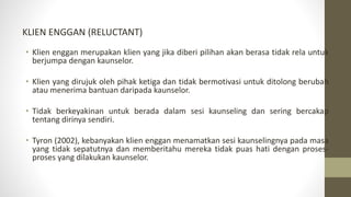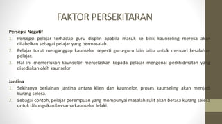 RUMUSAN Halangan yang wujud dalam kaunseling adalah sesuatu yang perlu dihadapi. 2 Klien datang lambat atau gagal menghadiri sesi kaunseling. 4 Klien berfalsafah dan ingin menunjuk pandai dalam sesi kaunseling.